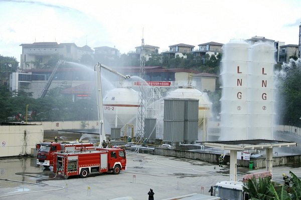 為進(jìn)一步加強(qiáng)安全生產(chǎn)應(yīng)急管理工作,提高燃?xì)庑孤┩话l(fā)事故的應(yīng)急處置能力,檢驗(yàn)罐區(qū)消防設(shè)施的有效性,最大限度地減少燃?xì)庑孤┦鹿始捌湓斐傻娜藛T傷亡和財(cái)產(chǎn)損失, 2015年12月10日下午四時(shí)許,曠遠(yuǎn)能源聯(lián)合莆田市住建局、市公安局、市質(zhì)監(jiān)局、市消防支隊(duì)、霞林派出所、莆田電視臺(tái)等單位,在城廂氣化混氣灌瓶站共同組織開(kāi)展“液化石油氣泄漏事故應(yīng)急演練”。曠遠(yuǎn)能源總經(jīng)理葉春、副總經(jīng)理黃劍鋒、副總經(jīng)理胡惠、總助陳麗群、總助施偉江及相關(guān)部門主管均到達(dá)現(xiàn)場(chǎng)全程參與演練,全市11家燃?xì)馄髽I(yè)代表獲邀至現(xiàn)場(chǎng)觀摩。