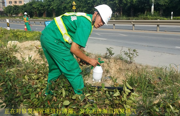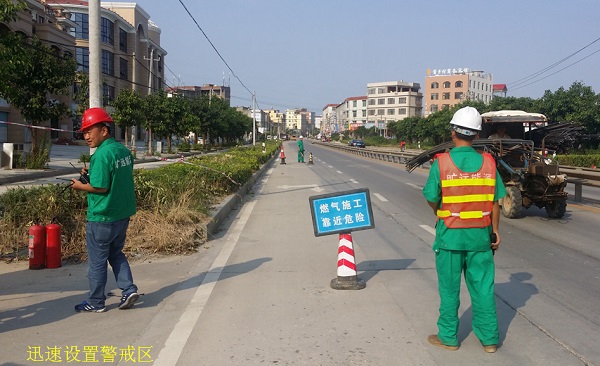 本次演練項目為:天然氣管道被第三方施工單位挖破后大量泄漏的應急處置。主要流程為:模擬事故發(fā)生、報警、應急啟動、人員疏散、安全警戒及交通管制、關閉上下游管道閥門、驅散泄漏燃氣、破損管道搶修、解除警戒、恢復供氣等。在演練過程中,所有參演人員嚴肅認真、節(jié)奏緊湊而又有條不紊地進行各個演練步驟,歷時近50分鐘后,演練圓滿完成。