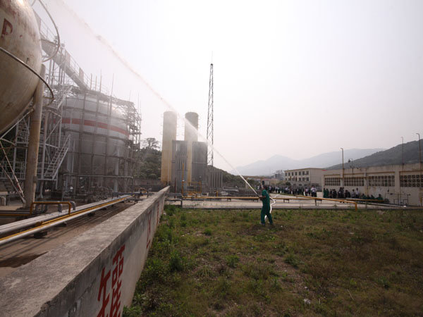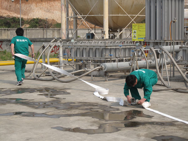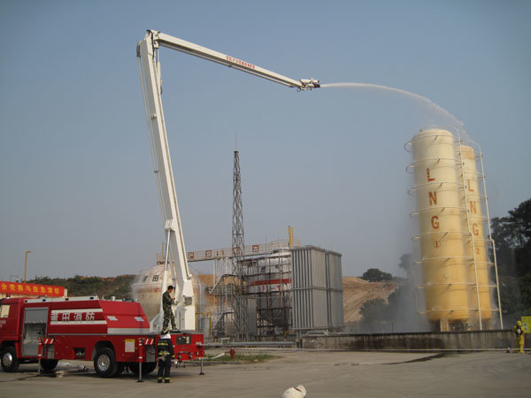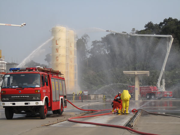 15:30分,隨著生產(chǎn)部報(bào)警聲響起,LNG灌區(qū)發(fā)生泄漏,現(xiàn)場指揮接警后立即按響報(bào)警器,指揮相關(guān)小組啟動(dòng)消防水泵,對(duì)灌區(qū)進(jìn)行緊急噴淋,隔離相鄰儲(chǔ)罐,并組織員工按預(yù)定區(qū)域到達(dá)避難位置。市消防派出2輛高噴消防車、6輛水罐消防車到達(dá)起火現(xiàn)場,火情偵檢組隨即展開偵檢,先用泄露儀對(duì)現(xiàn)場進(jìn)行濃度檢測,并用隔離帶劃出相應(yīng)的警戒線,保安配合警戒組疏散區(qū)域內(nèi)無關(guān)人員及在場使用中的車輛熄火,同時(shí)關(guān)閉大門,禁止除消防車、搶險(xiǎn)車外的一切車輛出入。在得知了著火位置和泄漏程度后,中隊(duì)指揮員立即下令,展開滅火行動(dòng)。消防隊(duì)員穿上消防戰(zhàn)斗服、佩戴防毒面具和呼吸器、攜帶銅質(zhì)工具和滅火器材迅速趕往事故儲(chǔ)罐,關(guān)閉儲(chǔ)罐根部所有閥門。而其余消防車按照預(yù)期指定位置,全方位對(duì)LNG灌體進(jìn)行火災(zāi)撲救。