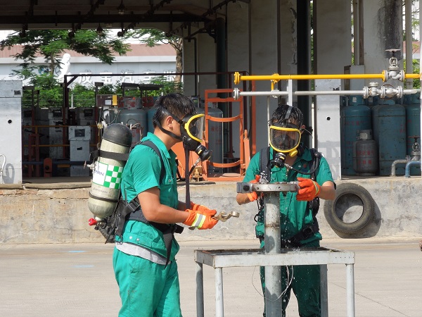 本次演練項(xiàng)目為:LPG1#儲罐底部出口閥被恐怖分子破壞造成液化石油氣泄漏事故的應(yīng)急處置。主要流程為:模擬事故發(fā)生、制服歹徒、報(bào)警、應(yīng)急啟動、人員疏散、安全警戒、消防噴淋驅(qū)散稀釋燃?xì)鉂舛?、搶險(xiǎn)堵漏及最終解除警戒等。在總指揮的領(lǐng)導(dǎo)下,所有參演人員嚴(yán)肅認(rèn)真、有條不紊地進(jìn)行各個演練步驟,歷時(shí)一個小時(shí)后,演練圓滿結(jié)束。