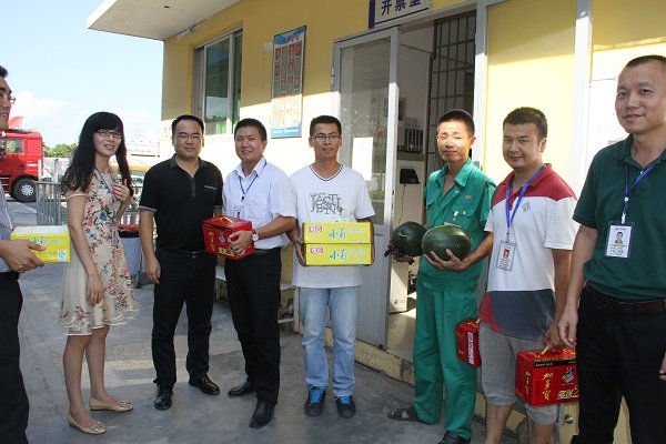 2014年7月29日,由集團(tuán)總裁辦、人力資源中心組成的高溫慰問團(tuán)代表集團(tuán)進(jìn)行莆田區(qū)域的高溫慰問活動,為在戶外高溫作業(yè)的一線員工送去消暑慰問品,曠遠(yuǎn)能源股份有限公司副總經(jīng)理黃劍鋒陪同慰問。