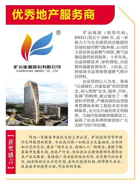 1月20日下午,在福州三坊七巷中瑞劇坊,由全國房地產(chǎn)商會聯(lián)盟、中國主流媒體房地產(chǎn)宣傳聯(lián)盟全程指導,福建房地產(chǎn)主流媒體聯(lián)盟主辦的“2017中國房地產(chǎn)榮譽榜暨第五屆福建地產(chǎn)年會頒獎盛典”圓滿落幕。曠遠能源憑借自身在地產(chǎn)行業(yè)服務與價值創(chuàng)造方面的突出表現(xiàn),獲得唯一“優(yōu)秀地產(chǎn)服務商”大獎,民生服務價值獲行業(yè)權威認可。在頒獎環(huán)節(jié),曠遠能源代表對主辦方的積極努力和取得的豐碩成果表達了感謝,并表示“..