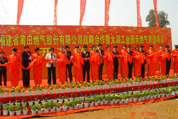 莆田燃氣公司于2010年4月30日在城廂區(qū)太湖工業(yè)園就天然氣管道項目舉行了隆重的開工儀式,剪彩的有城廂區(qū)五套班子、區(qū)委書記、區(qū)委副區(qū)長、曠遠集團副總裁魏文喜等領(lǐng)導(dǎo)。目前太湖工業(yè)園區(qū)共招商10多家工業(yè)用戶,為我司后期提升燃氣銷售增長點提供了良好的開端。